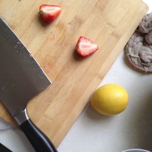 将草莓切成小块。放入碗里。加入白糖。将其揉搓均匀。放置30分钟。放入锅里,开小火熬制,待水分蒸发,草莓变粘稠,加入柠檬汁(适量)在熬制5分钟。即可