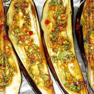取出烤好的茄子,翻面,将调味酱均匀浇在茄肉上,再入烤箱烘烤1-2分钟至酱汁开始起泡即可。