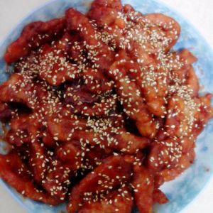 把猪里脊切成手指粗的长条,裹入淀粉,下锅炸至金黄捞出,下锅再炸一次至酥脆
