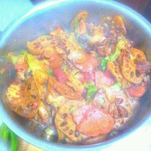 最后放青菜炒均匀,调入盐,味精,糖,酒,酱油。大火炒。