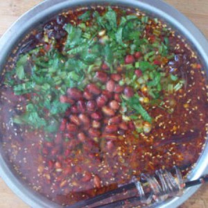 锅里倒入水开后加入粉条,油菜至粉条煮熟关火,粉条连同水一起倒入一个空碗里,加入调好的辣油,放入香菜,葱,榨菜,花生米即可.