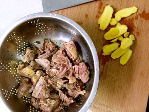 准备好材料:姜去皮切片;鸭肉剁成块,用开水焯五分钟后捞出冲洗掉浮沫,沥干
