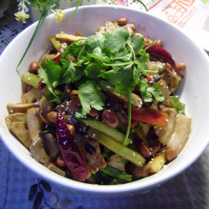 加入黄瓜段和捏干的香莴笋段煸炒均匀,加盐,糖,少许辣椒油,花椒粉拌匀,然后撒入花生米、白芝麻,再撒些香菜即可(家里有小型的锅子的话,可以象店里一样直接把锅子端上桌,好有气氛的说,呵呵)