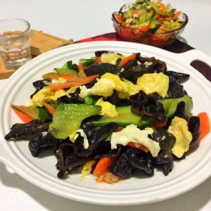 加入木耳(一定要沥干水分,避免溅伤)翻炒片刻加入胡萝卜至木耳七八成熟加入黄瓜继续翻炒