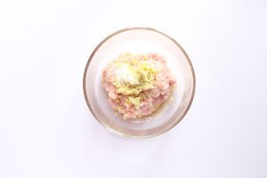 将肉剁沫,切入姜蒜沫倒入生蚝、盐、白糖和二勺生粉拌匀。