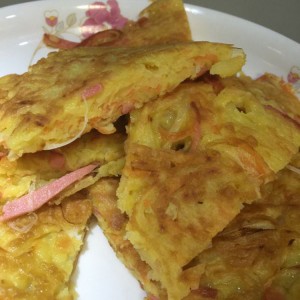把之前的丝都混在一起,加入鸡蛋,面粉,盐,黑胡椒,香葱,我今天没有香葱了,就放了大葱丝,不爱吃葱的可以不放,按照自己的口味调整。