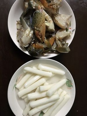 蟹杀掉洗好,剁块,如图^_^年糕条放水里泡一泡
