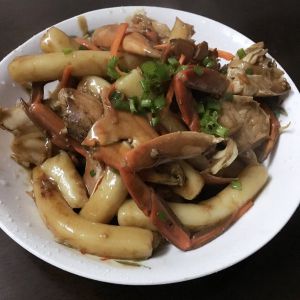 姜丝入油锅,蟹也放进去,爆炒十铲左右,放入年糕条翻炒~十几下后,放入海天海鲜酱一勺翻炒,加入之前勾兑的酱汁翻炒~着色以后再放半碗水,收汁,撒入葱花和胡萝卜丝,翻一下,出锅^_^