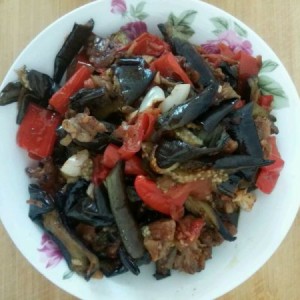 肉切薄片,生姜切成沫(或薄片),洋葱切碎,蒜拍后剁碎。茄子要一剖为二,长了可以再切但不可以太小,不出菜,难出锅。红辣椒切段
