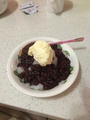 在碎冰上放上红豆,加炼乳,加一球冰淇淋,开吃。
