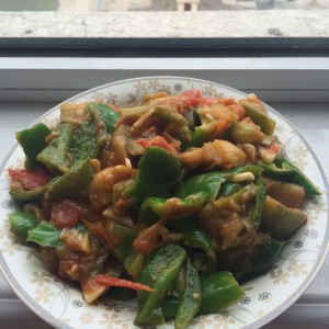 茄子和西红柿炒2分钟,放青椒和1小勺盐,炒1分钟,出锅前放蒜沫。