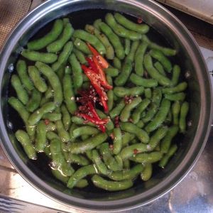 凉水下毛豆、花椒、八角、辣椒,放盐大火煮开后转小火焖煮15分左右