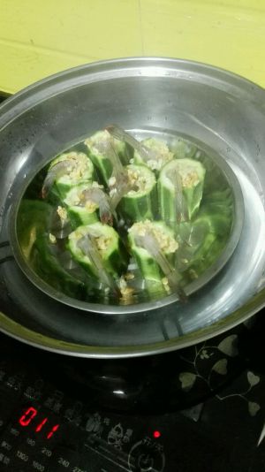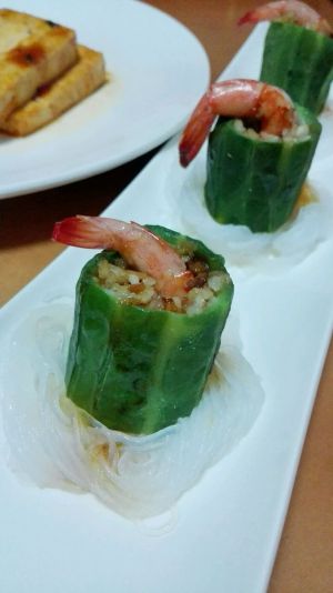 粉丝团垫底,放上丝瓜盅,用热油拌辣椒酱浇上丝瓜盅。