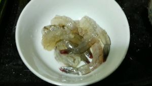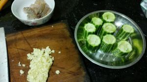 把虾仁和蒜蓉放进丝瓜盅里。大火蒸8分钟。粉丝泡好,开水焯熟,过冷水备用。