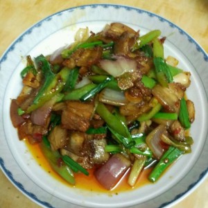 加入青椒,洋葱,蒜段,加点白糖提味,翻炒一会加入蒜叶,快出锅时加一点盐。关火用余热翻炒一会。出锅。