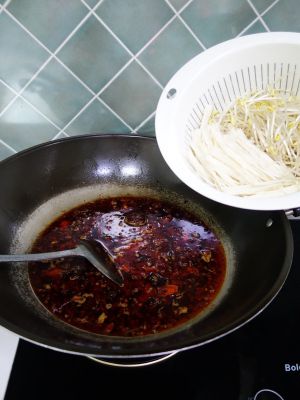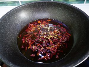 另锅放花生油和辣椒油的混合油,四成热时放剪好的干辣椒、花椒,炒片刻,连油快速倒入菜品中。