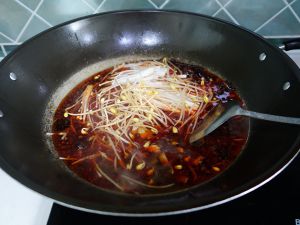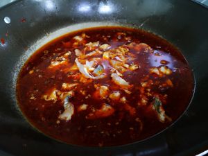锅里烧油,油稍微多一些,油温八成热时下郫县豆瓣、姜片、蒜片、草果、八角、花椒,中火混合炒香。
