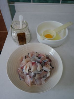 番薯淀粉加少量的水润湿,再与鸡蛋清一起,加入腌好的鱼片中,用手充分揉匀,手部动作轻柔,否则容易破坏鱼肉组织。