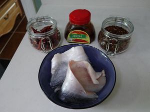 鱼去骨及头尾,取用带皮的鱼柳。我这次用的巴沙鱼,平常用草鱼的时候更多。图片一同展示的还有干辣椒、花椒及郫县豆瓣酱。