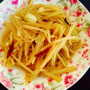 锅里热油,放入辣椒蒜头爆香,放进土豆丝翻炒几下,加入盐,白糖,生抽调味,翻炒均匀,然后加入香醋。翻炒片刻即可出锅。