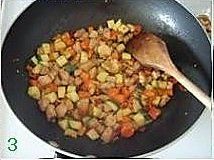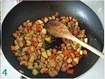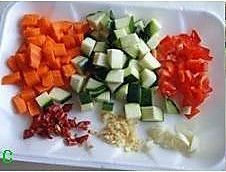 爆香辣椒姜蒜碎加入素菜丁翻炒1-2分钟;