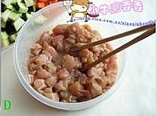 鸡肉切丁,用适量料酒、盐、香油、陈醋、生抽、黑胡椒、水淀粉腌制至少30分钟以上;