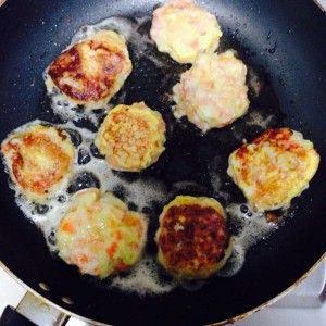 面粉火腿胡萝卜和盐加入土豆泥中搅拌均匀,用手捏个小饼然后滚上一层蛋液。