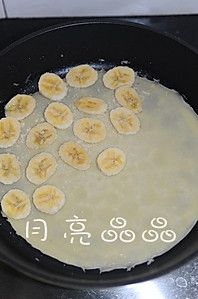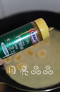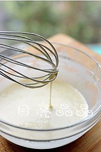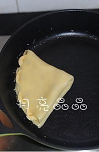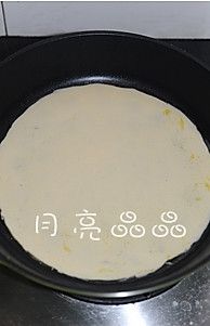 平底锅擦黄油,倒入面糊,转开让面糊在锅底成圆形,