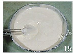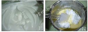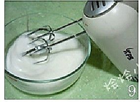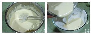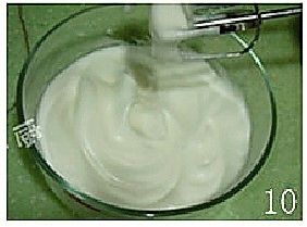 蛋白打发至湿性接近干性发泡状态,提起打蛋器,立起的尖稍为有些弯勾。取1/3蛋白糊放入蛋黄糊中。