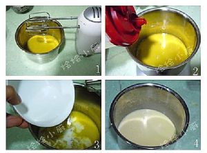 蛋黄用祈和打蛋器稍搅拌一下。加入沙拉油用祈和打蛋器打蛋器拌匀,加入椰浆和牛奶,用祈和打蛋器搅拌成均匀的蛋黄糊。