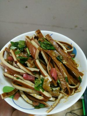 将豆干洗干净,切条,在将葱姜蒜花椒泡姜酸萝卜切碎。将所需调味料一起放入碗里搅拌腌制。