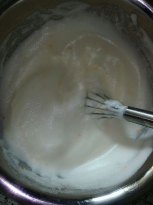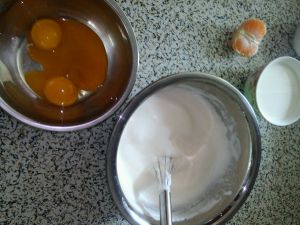 第一步 蛋黄和蛋清分离,蛋清里放盐小半勺,橘子去皮捣碎半个,糖一勺,打成图片奶油状掉不下来就对了