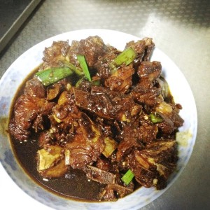 放入排骨炒至金黄倒入适量料酒,葱姜蒜