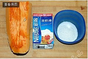 蒸熟的老南瓜快,放入食物搅拌机,倒入50毫升淡奶油和25克白沙糖打匀,装碗。滴几滴淡奶油,用牙签划开即可。