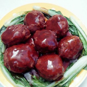 最后把青菜用热水烫一下摆盘,未煮干的肉汁用水淀粉调成高汤靓汁,最后浇在狮子头上,ok,完成