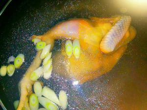 沸水中加入10g姜片,大葱片,料酒,给三黄鸡煮沸,换小火,开始计时闷煮10分钟,关火再闷10分钟。