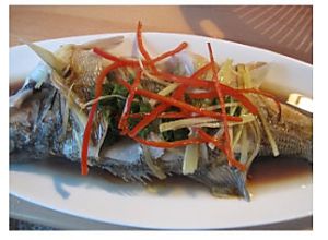 放入适量猪油,铺上姜丝,入开水锅中大火蒸5分钟,取出撒上葱花;