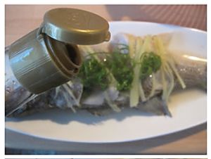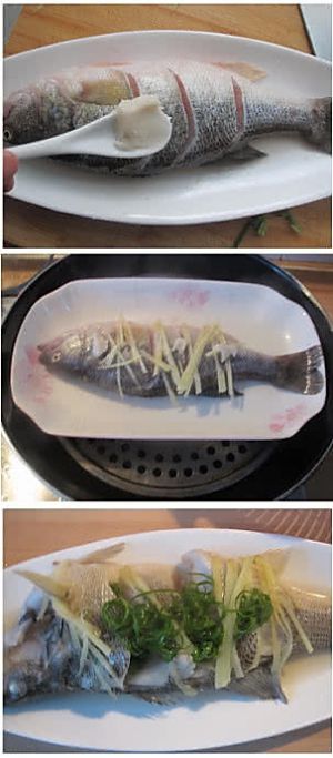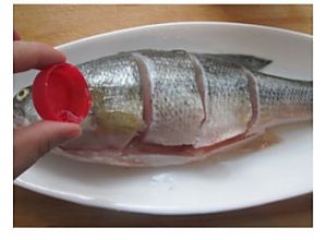 在鱼身上均匀的倒入蒸鱼豉油或美极鲜味汁;