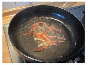 然后将红椒丝与油烧滚热后浇在葱花上即可。