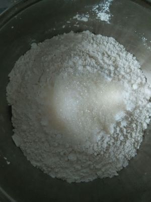 将糯米粉、粘米粉、澄粉、白砂糖、炼奶放入一个盆中