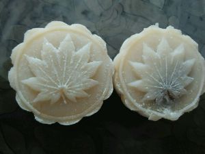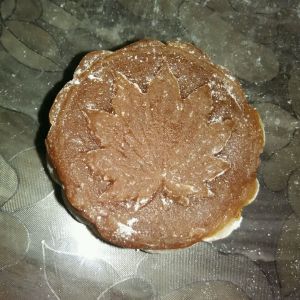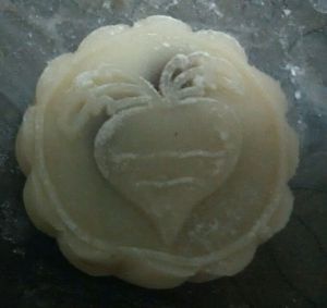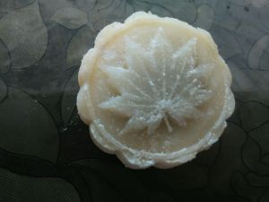 将圆面团按扁,捏大,将豆沙馅放入,包紧,收口,搓圆,在月饼模上撒点熟糯米粉并将搓好的未成形的月饼放入盖模