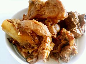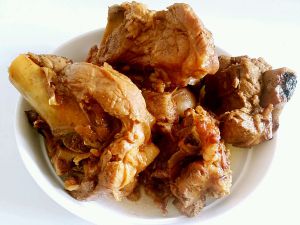 棒骨压熟后,将汤和骨头一起倒入炒锅,收汁。