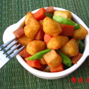 加入炸好的馒头丁翻炒;
