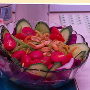 铺紫甘蓝,青木瓜丝、荷兰豆丝、加小番茄拌匀,浇上酱汁,撒花生