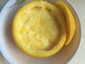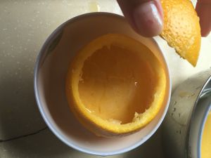 将混和蛋液倒入橙子皮中(不要太满,否则蒸的时候会溢出)