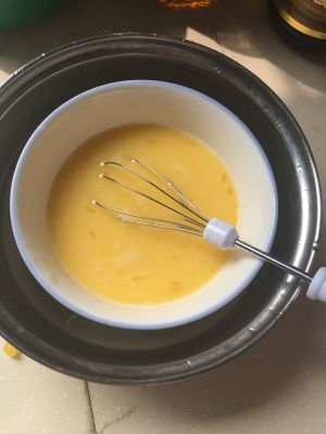 鸡蛋用打蛋器打匀,滤出蛋筋。与牛奶和橙汁混合,加入适量白糖。