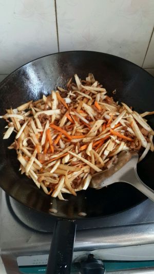 然后将茭白丝和胡萝卜丝倒入锅中翻炒,要出锅前放入适量的盐、糖、鸡精等