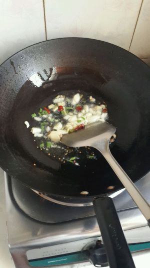锅烧热倒油,葱姜蒜红椒放入炒香