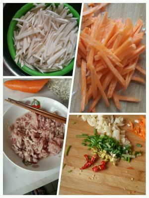 将茭白、胡萝卜切丝备用,肉丝准备好,葱姜蒜和红椒切好