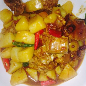 放入切好的土豆,翻炒,放盐,八角,香料,等!放250克水。放青红椒,盖上盖子煮10分钟!